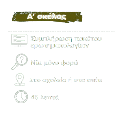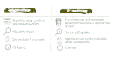 Οι μαθητές θα συμπληρώσουν ένα πακέτο ερωτηματολογίων διάρκειας περίπου 45 λεπτών. Εάν λάβατε την ενημέρωση αυτή από το σχολείο του παιδιού σας, τότε η συμπλήρωση του ερωτηματολογίου αυτού θα πραγματοποιηθεί στις αίθουσες ηλεκτρονικών υπολογιστών της σχολικής μονάδας εντός σχολικού ωραρίου, παρουσία μέλους της ερευνητικής ομάδας και του υπεύθυνου εκπαιδευτικού. Εάν λάβατε την ενημέρωση αυτή εκτός σχολικής μονάδας, τότε η συμπλήρωση θα γίνει μέσω ατομικού συνδέσμου που θα σας σταλεί στον προσωπικό σας ηλεκτρονικό υπολογιστή, ή σε τάμπλετ ή κινητό.